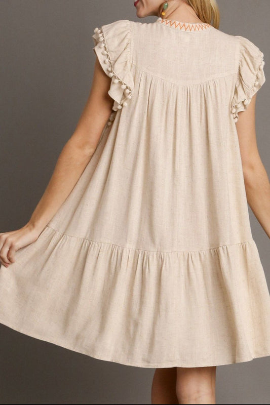Floral Embroidery Pom Pom Ruffle Sleeves Mini Dress