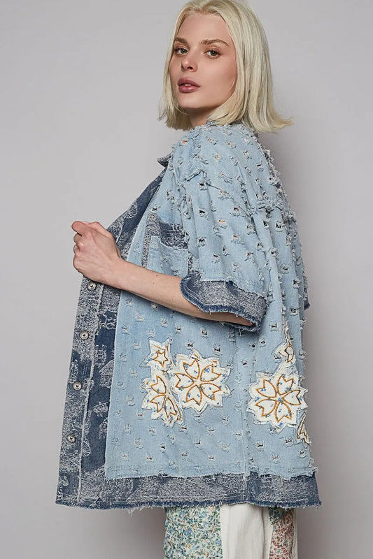 POL Distressed Button Up Half Sleeve Denim Shirt